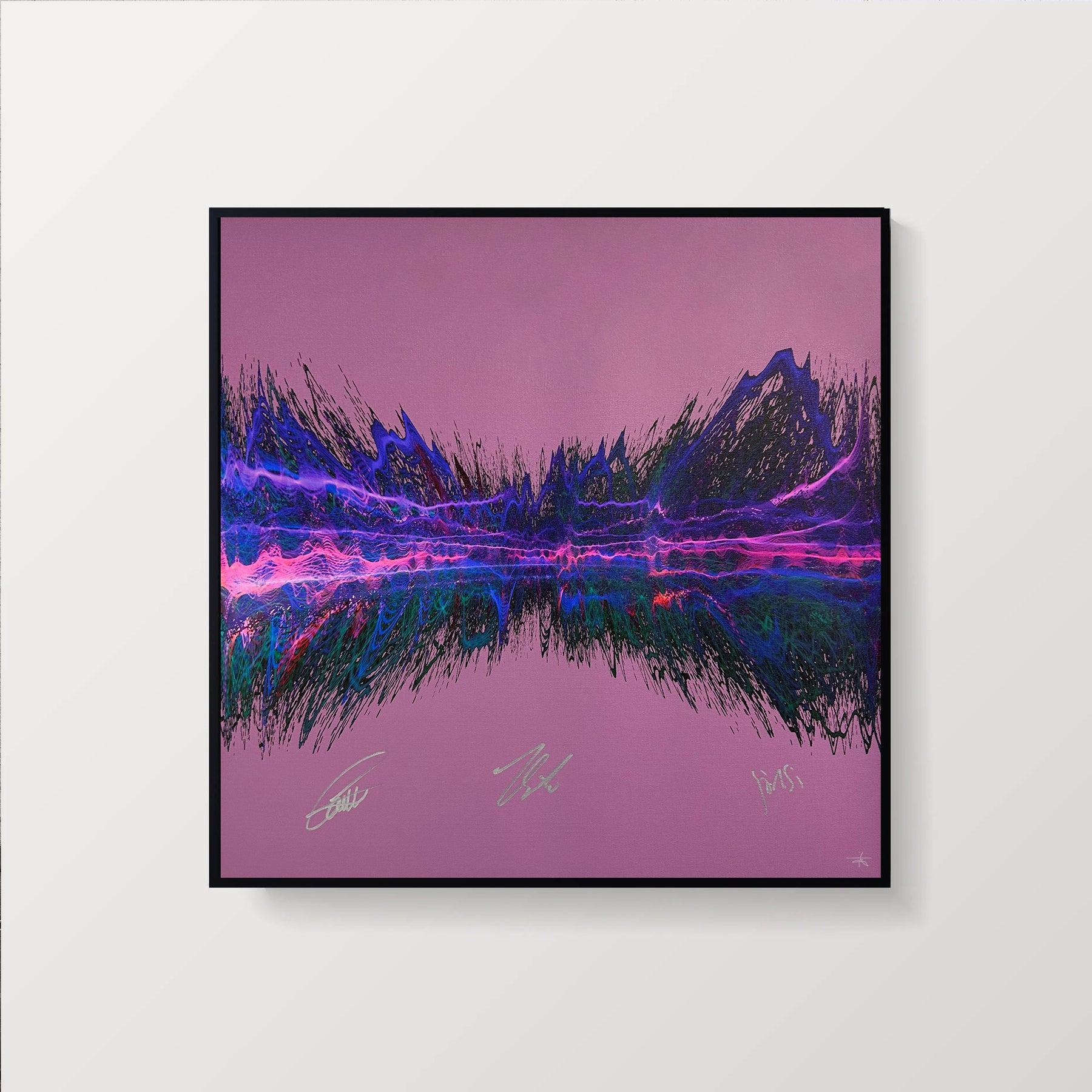 Our Originals measure 38″ x 38″ and often feature a lyric or the title of the song written by the artist in addition to their signature. These are much more limited edition – there is only one Original created per design. Originals sometimes come in alternate color palettes or wave designs to the prints.