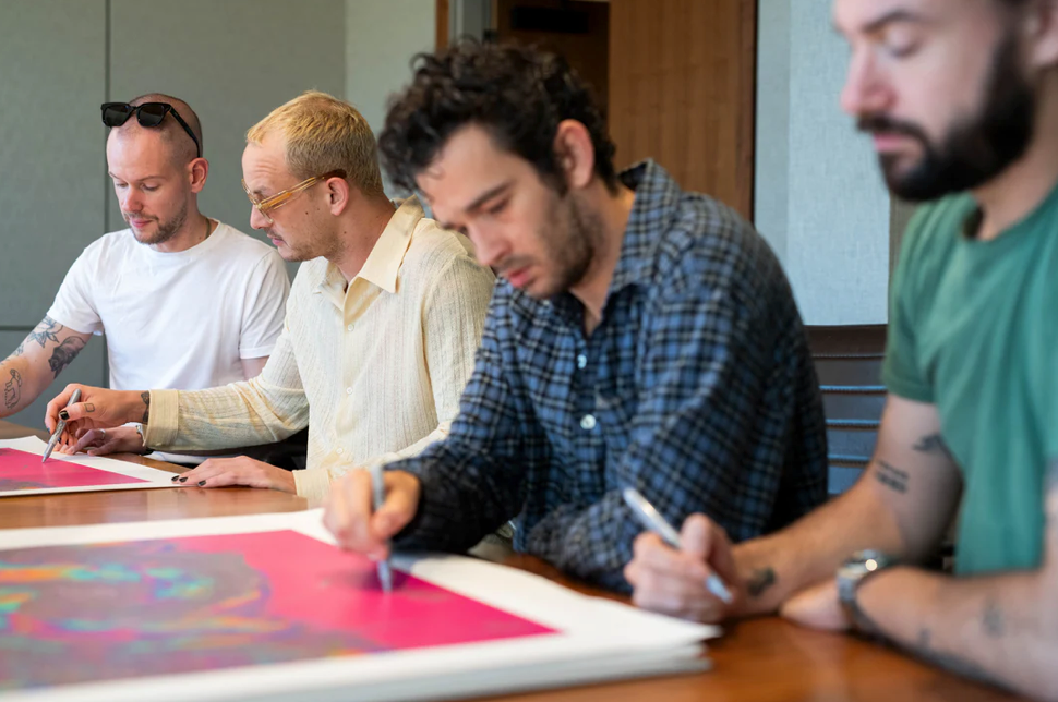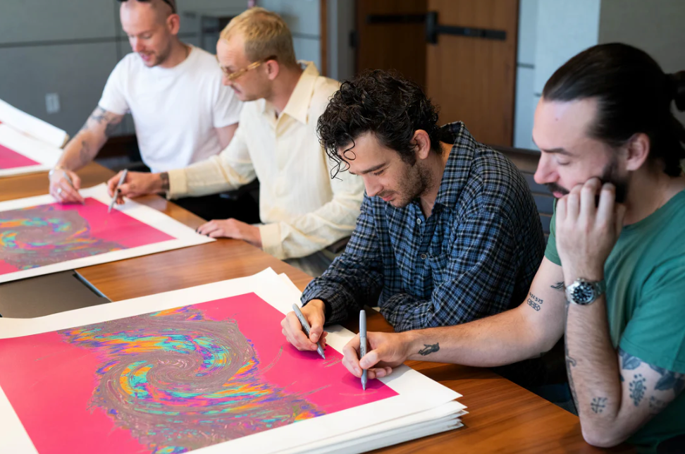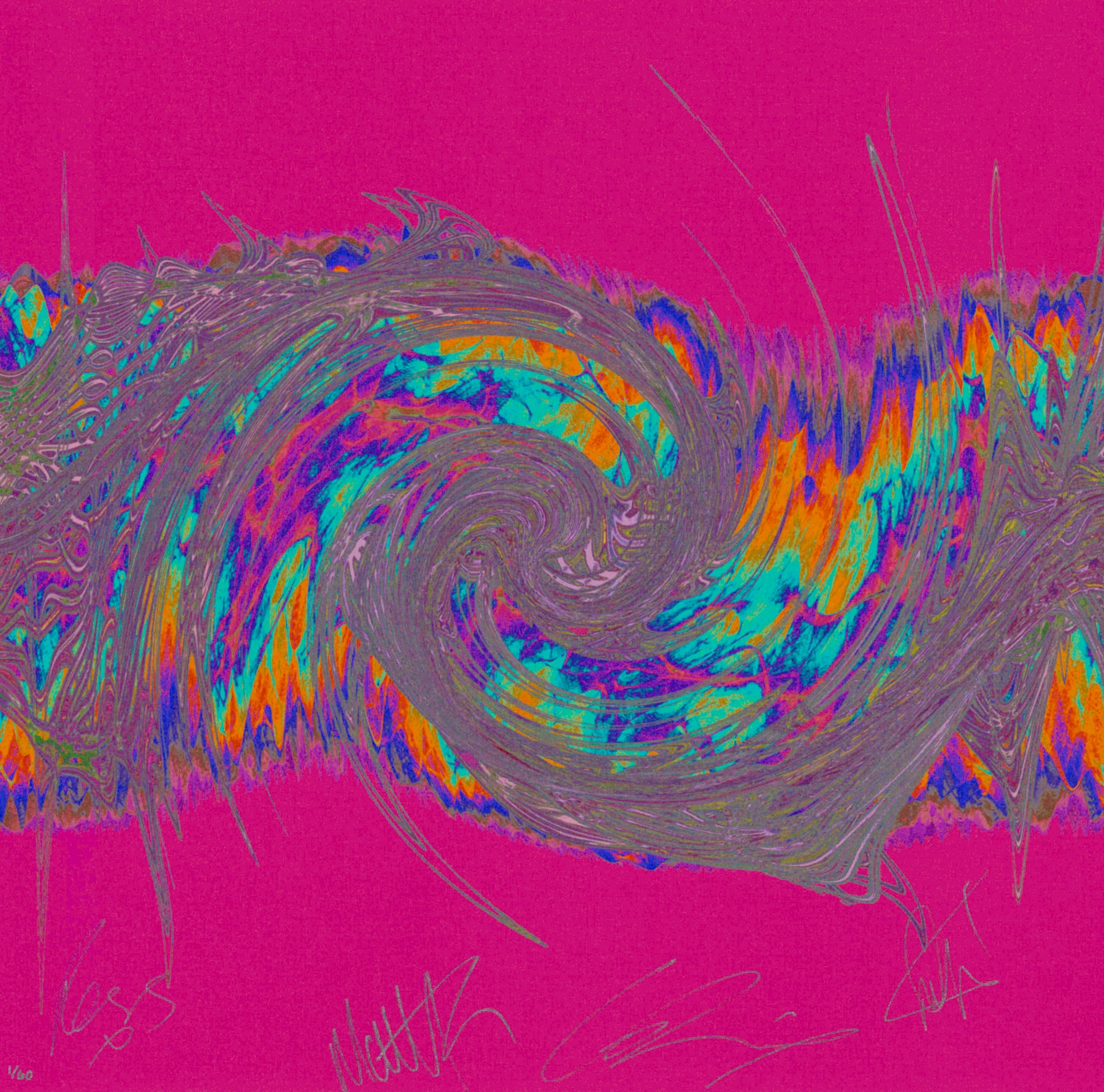 Our Originals measure 38″ x 38″ and often feature a lyric or the title of the song written by the artist in addition to their signature. These are much more limited edition – there is only one Original created per design. Originals sometimes come in alternate color palettes or wave designs to the prints.