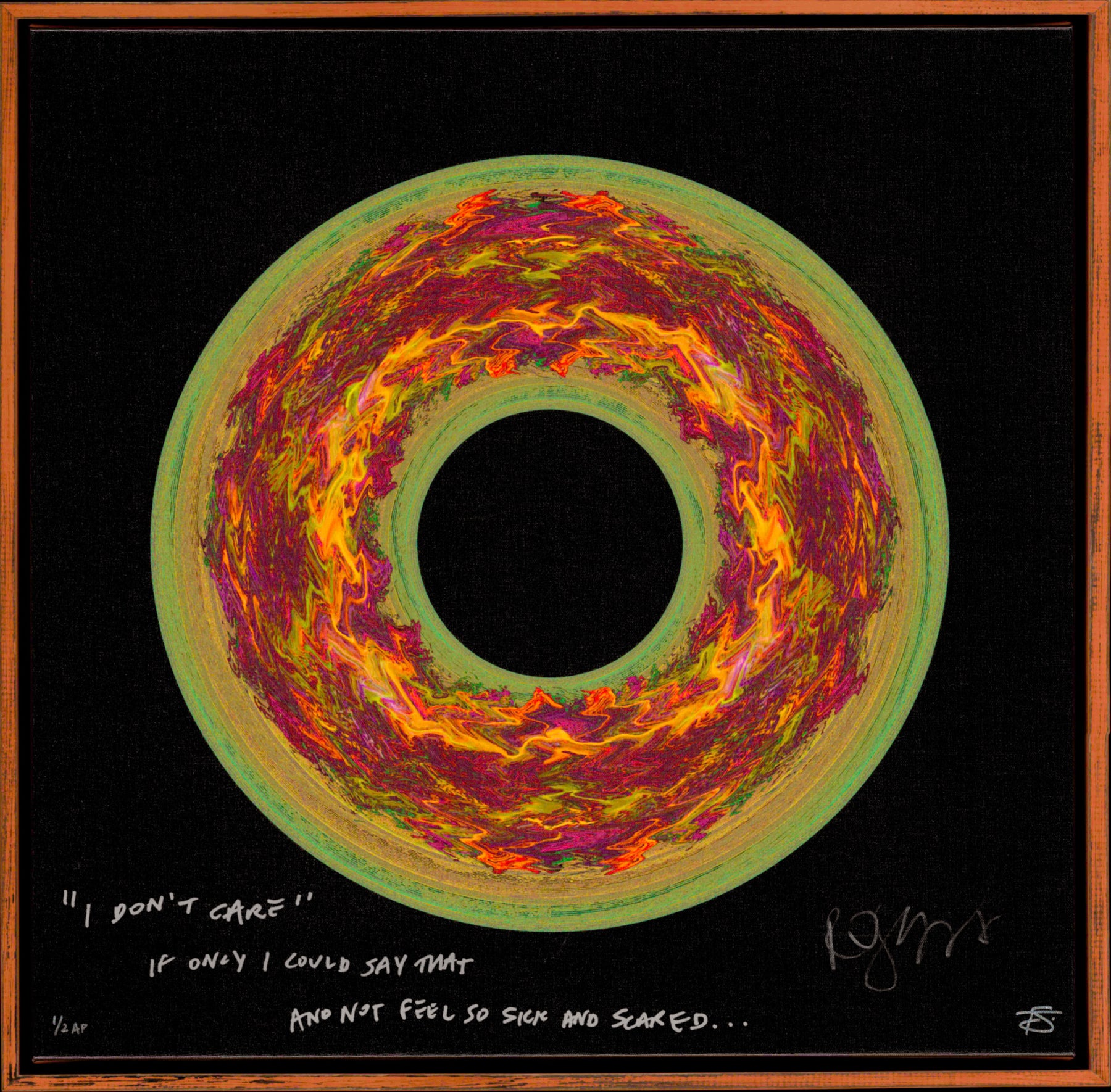 Our Originals measure 38″ x 38″ and often feature a lyric or the title of the song written by the artist in addition to their signature. These are much more limited edition – there is only one Original created per design. Originals sometimes come in alternate color palettes or wave designs to the prints.