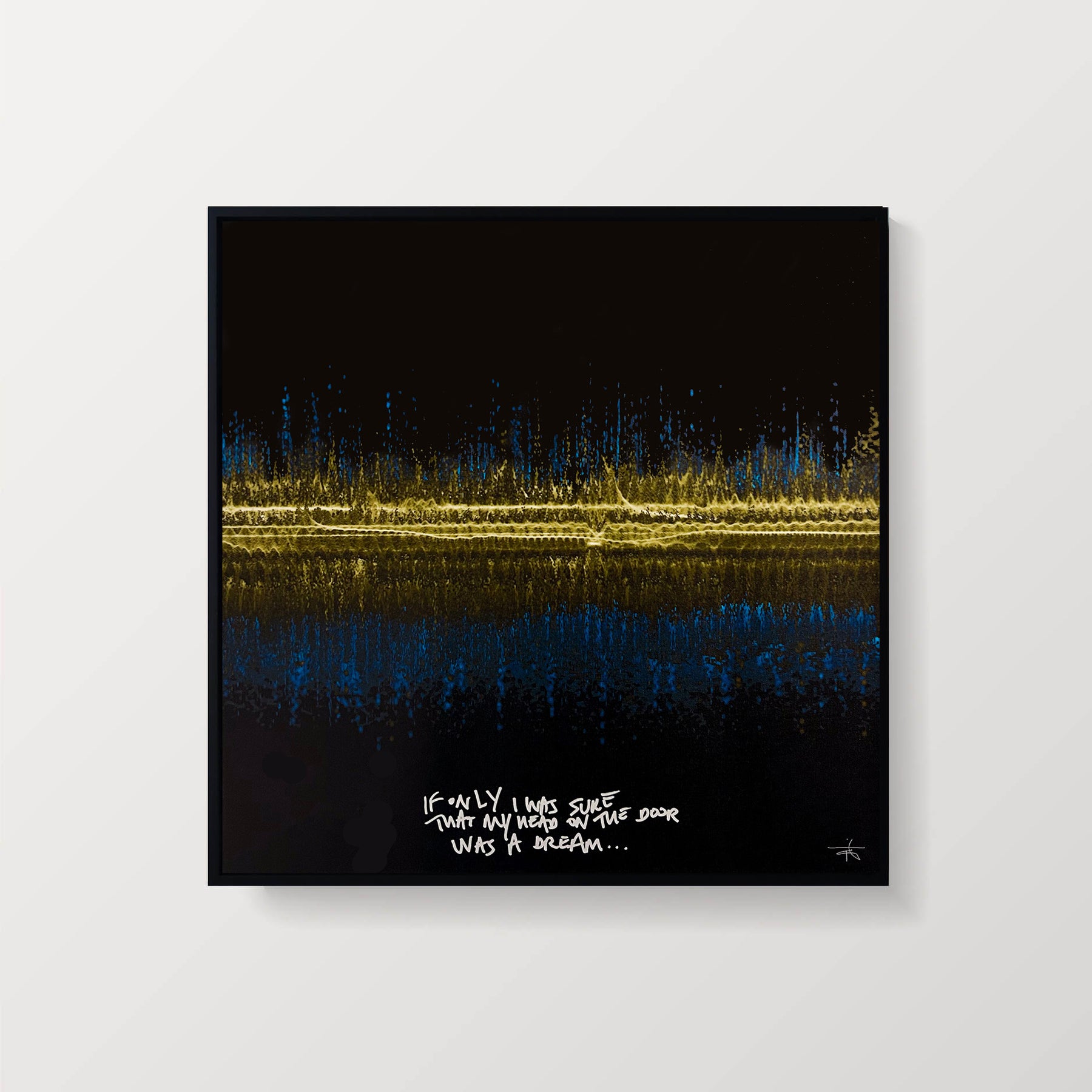 Our Originals measure 38″ x 38″ and often feature a lyric or the title of the song written by the artist in addition to their signature. These are much more limited edition – there is only one Original created per design. Originals sometimes come in alternate color palettes or wave designs to the prints.