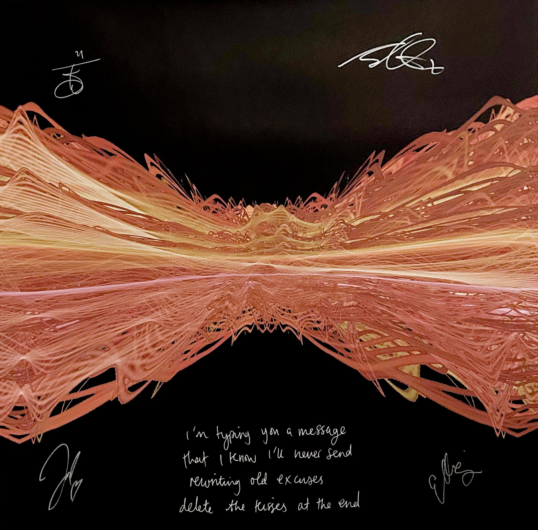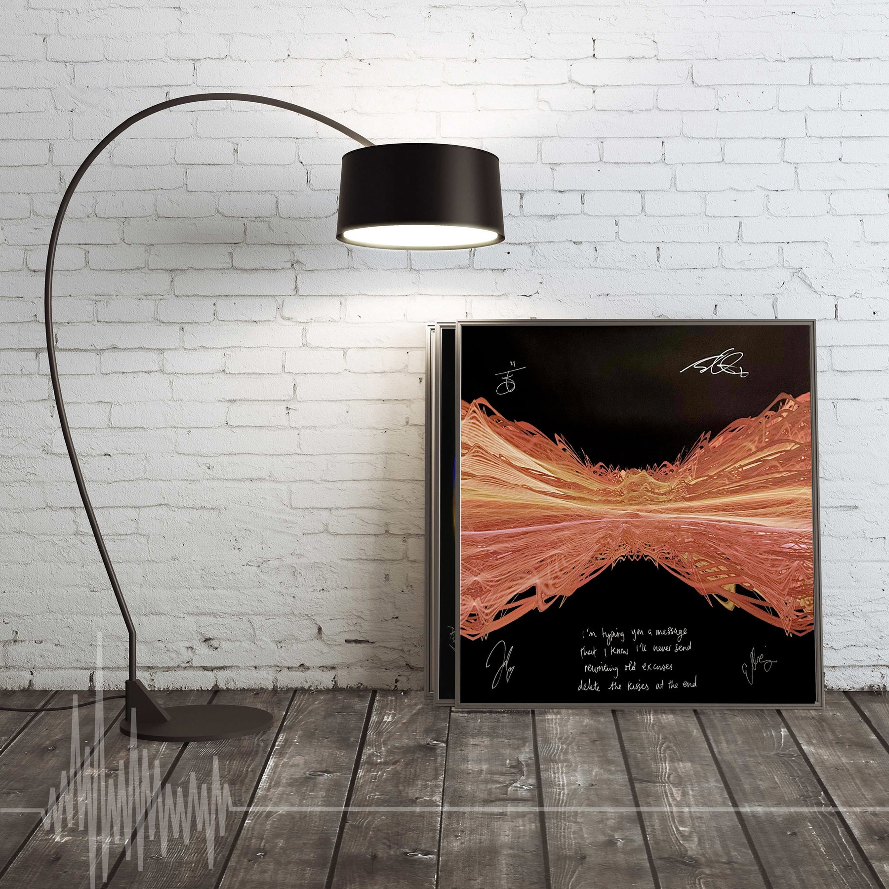 Our Originals measure 38″ x 38″ and often feature a lyric or the title of the song written by the artist in addition to their signature. These are much more limited edition – there is only one Original created per design. Originals sometimes come in alternate color palettes or wave designs to the prints.
