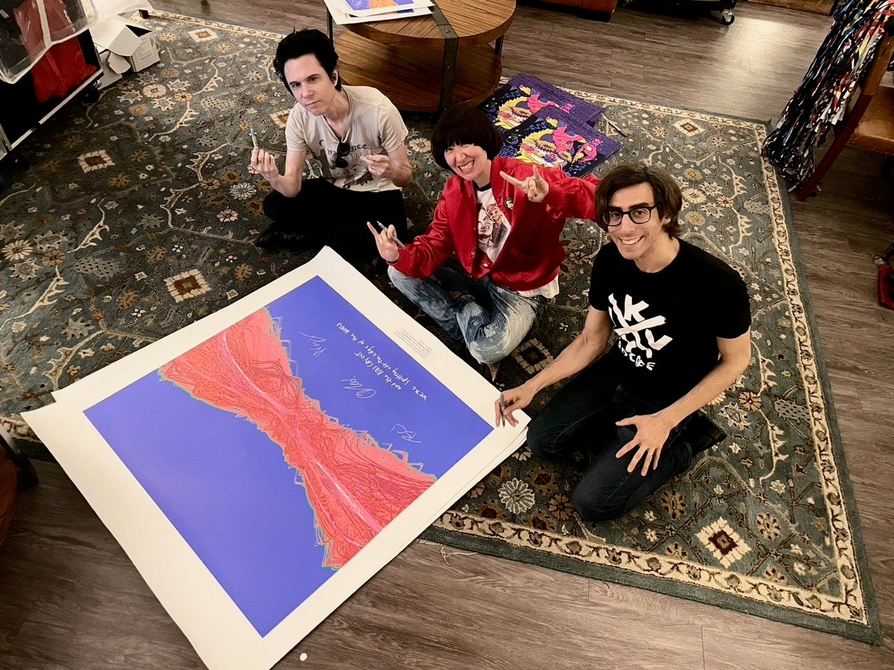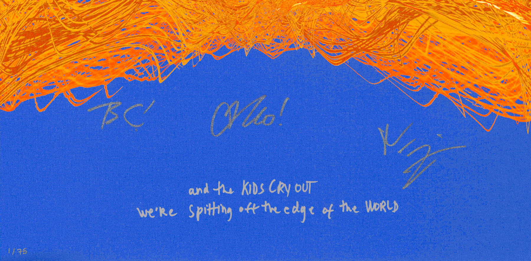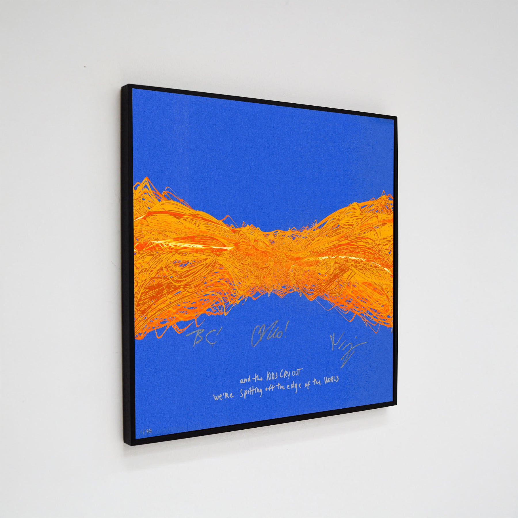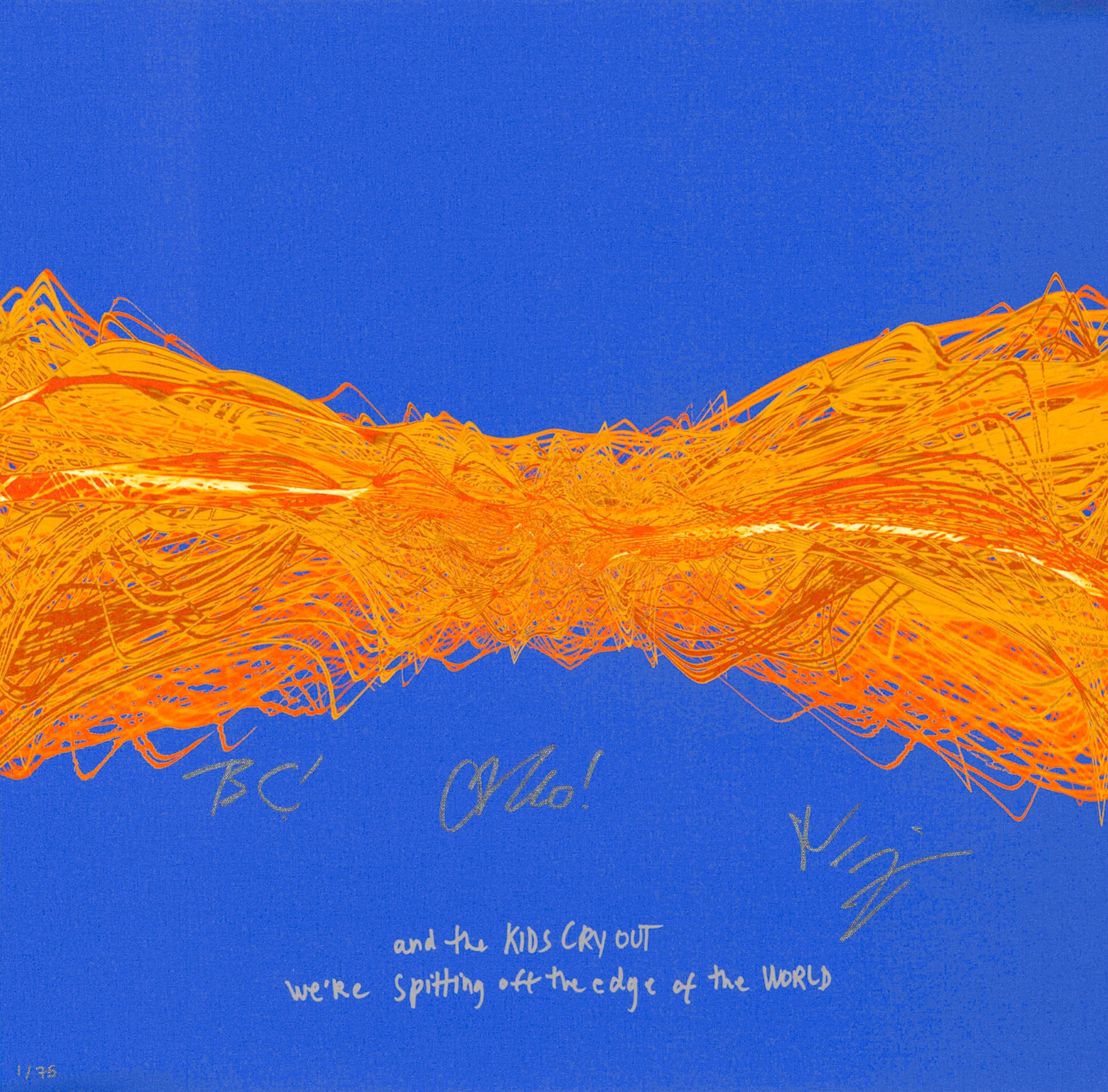 Limited edition of artwork made from the sound waves of the Yeah Yeah Yeah's "Spitting Off The Edge Of The World." This print is hand signed by band members Karen O, Nick Zinner, and Brian Chase. Each print features a printed lyric in Karen O's handwriting.